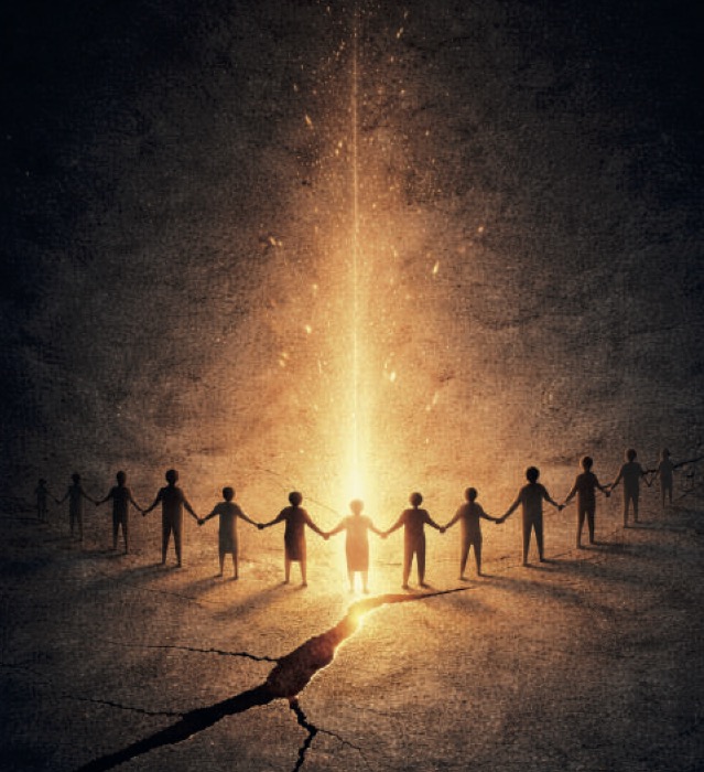 Intorno alla crepa sono disposte alcune piccole figure stilizzate che si tengono per mano. Non hanno tratti individuali: sono sagome essenziali, prive di dettagli, proprio per rappresentare l’umanità nel suo insieme. La loro posizione circolare e il gesto del tenersi uniti comunicano un forte senso di comunità e solidarietà. Non fuggono dalla ferita, non la ignorano: si dispongono accanto ad essa, quasi ad abitarla e a custodirla insieme.
